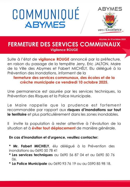 Vigilance rouge - Fermeture des écoles vendredi 10 octobre