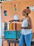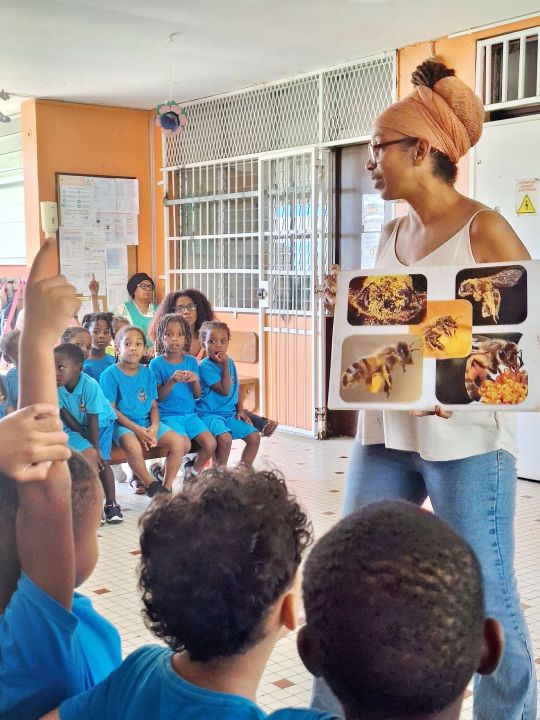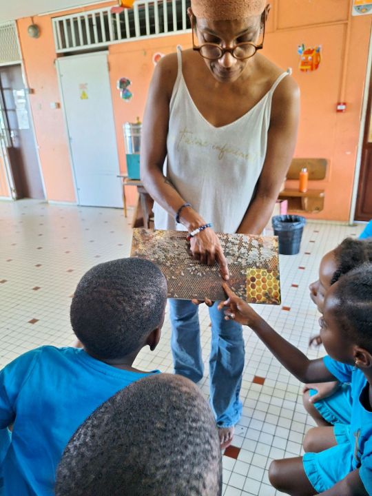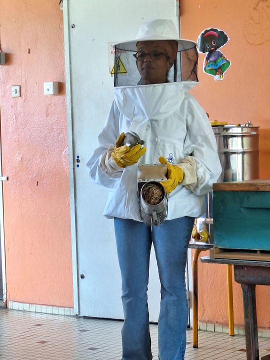 - la visite d'une apicultrice, BeeDivine, qui nous a expliqué son métier et la fabrication de miel par les abeilles. Elle nous a montré son matériel : la ruche, les cadres avec les rayons de cire et les alvéoles, l'enfumoir, l'extracteur, et sa tenue d'apicultrice. Elle nous a fait goûté deux sortes de miels différents. Elle nous a montré des photos d'abeille récoltant du pollen et du nectar.